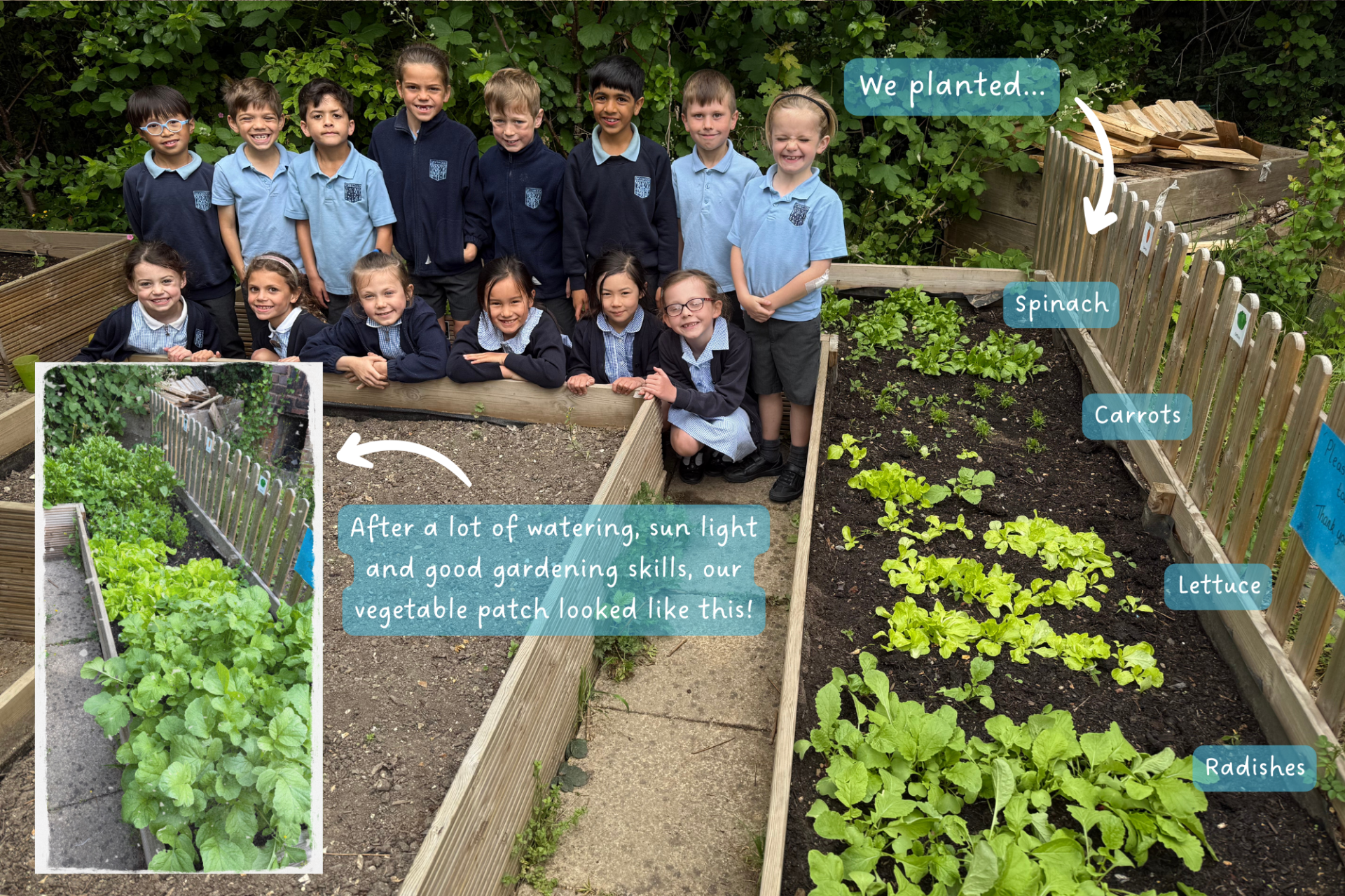 Last term, Year 2's science lessons were all about plants! The children learnt what a plant needs to begin germinating and to continue to grow strong and healthy. To put our knowledge to the test, we planted some vegetables out in the flower beds and ... it was a success!