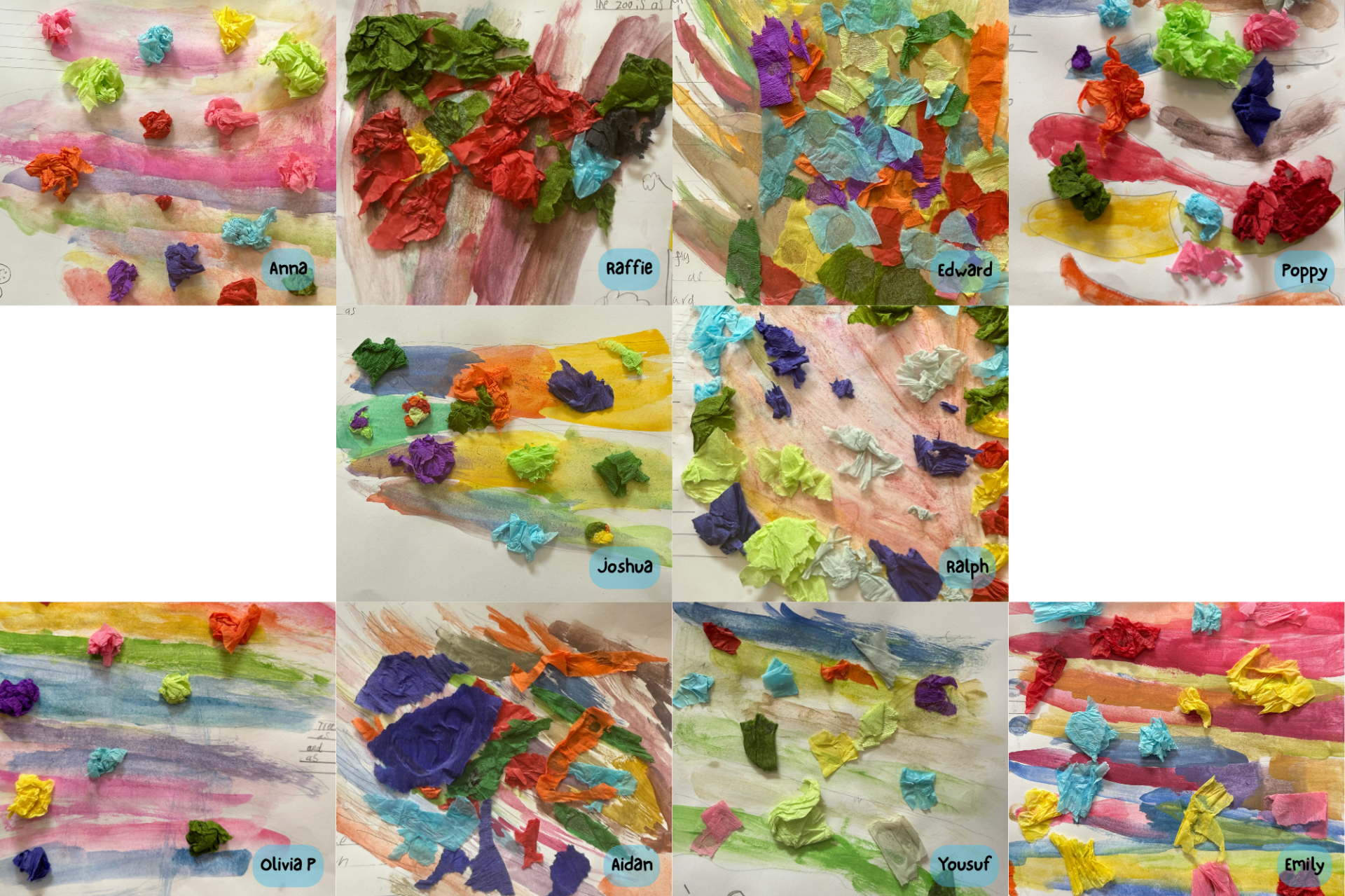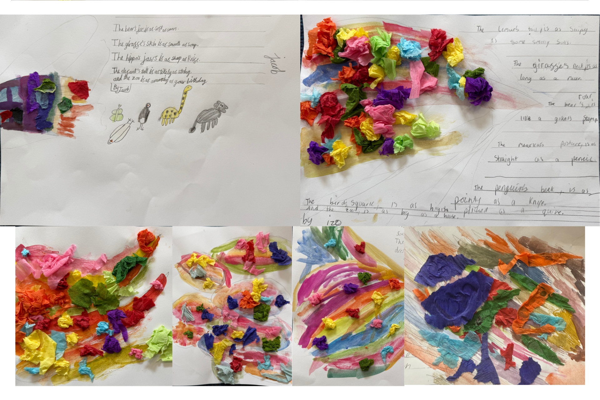 To accompany the poems, we had an art lesson where the children created a watercolour collage inspired by the colourful feathers of the parrots we saw during the bird show. Using watercolour paints and tissue paper, they carefully recreated the vibrant textures and patterns of the parrots’ feathers.